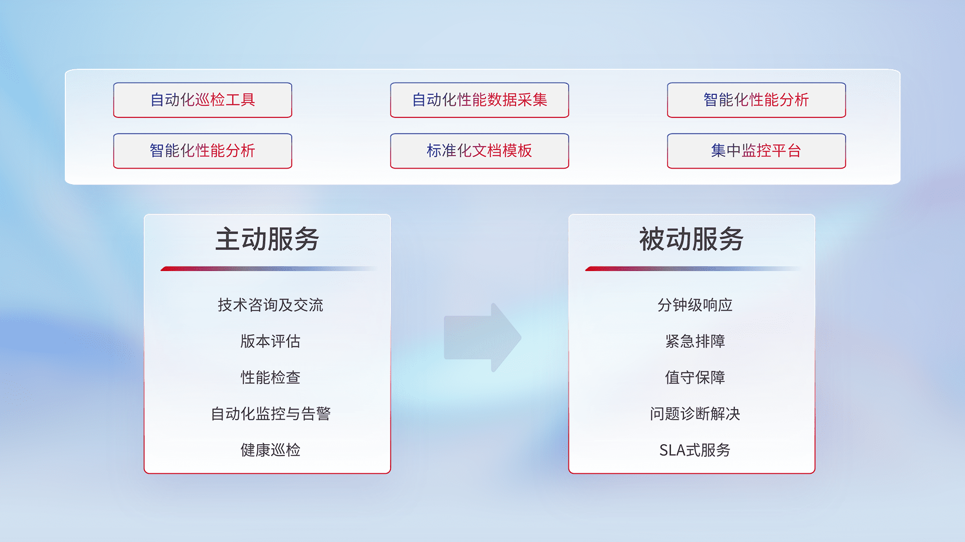 智能化工具和标准化文档,,,,保障服务质量,,,,提供主动服务(包含技术咨询、、版本评估、、、、性能检查、、、自动化监控与告警、、、、健康巡检)和被动服务包含(分钟级响应、、、、紧急排障、、、、值守保障、、、问题诊断解决、、、SLA服务)。。。。